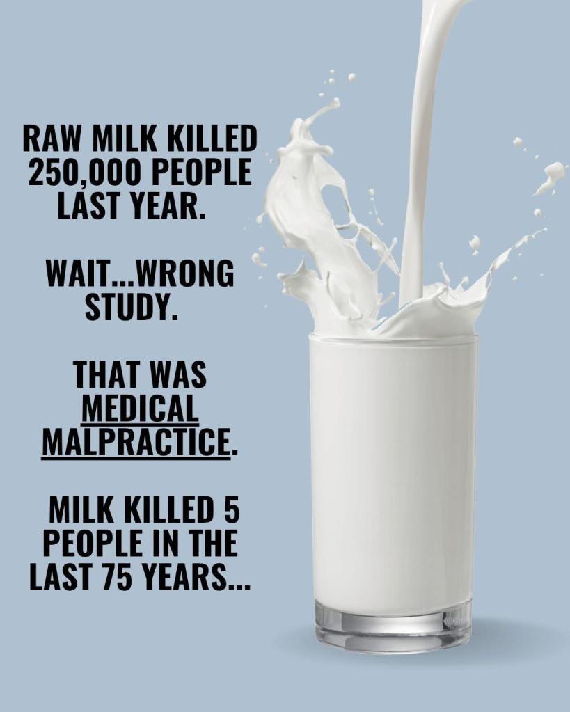 This was shared by someone I know. I generally consider this person to be reasonable and intelligent, but we all fall prey to faulty but effective rhetoric sometimes. I’m not entirely sure what the specific message they hope for the reader to take away is, but I’m guessing it’s something like this: raw milk is natural, and its dangers have been incredibly overblown. The medical system is very dangerous, and you should be distrustful of doctors and other practitioners. There are several things about this that I find troubling.